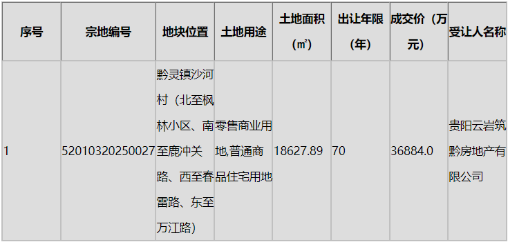 云岩区两宗住宅用地分别被贵阳云岩筑黔房地产有限公司和贵阳六岩天秀房地产有限公司竞得,成交价分别为3.69亿元和2.40亿元,显示出核心区域住宅用地持续受到市场青睐。